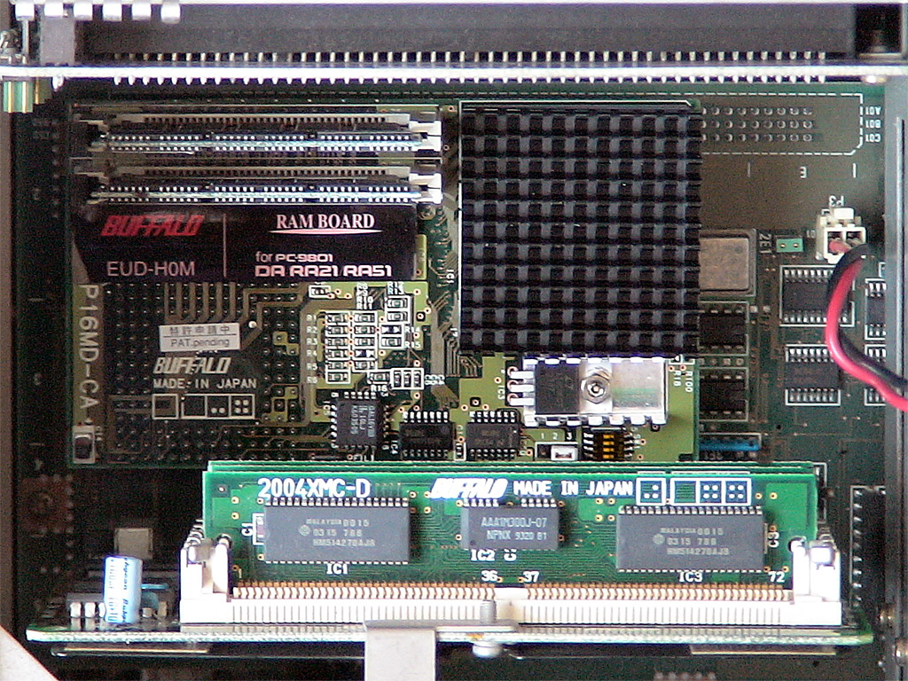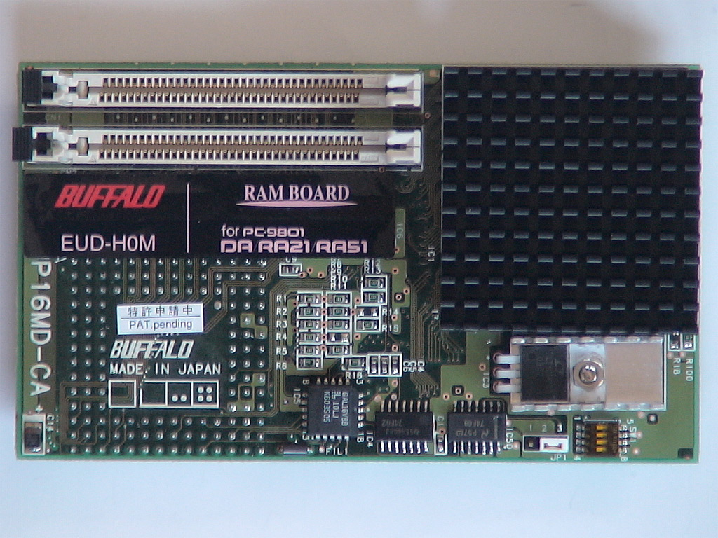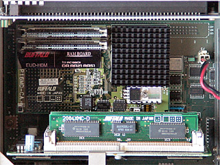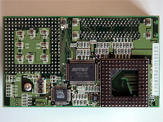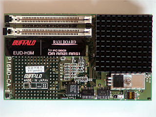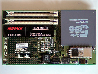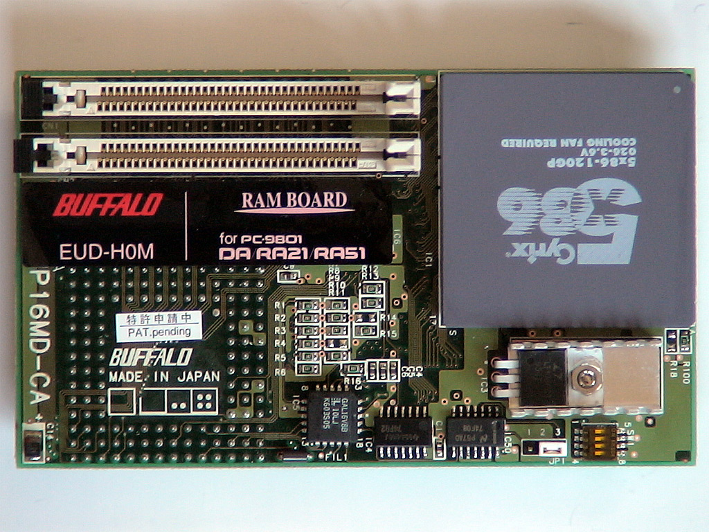 EUD-H0M![]() Cyrix 5x86-120GPを使用したBUFFALO製のPC-9801RA/DA用アクセラレータです。 メモリ増設用スロットを2本備えており、最大で32MBのメモリを2枚増設可能です。 メモリは本体クロックの2倍、CPUは本体クロックの6倍で動作します。` Cyrix 5x86というと、緑色のヒートシンクが装着されているのが通常であり、パッケージの写真もそのようになっておりますが、当方が入手した固体は黒いヒートシンクが装着されています。 なお、1996.1版のBUFFALOカタログ写真では、緑色のヒートシンクだったものが、1996.6版では黒いヒートシンクに変更されているため、当方が入手した固体は、いわば後期型といえるもののようです。