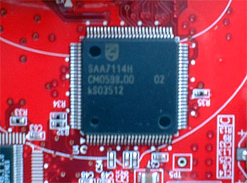メモリクロックが低いせいかヒートシンク無しのむき出しなので、メモリチップの型番を確認することができます。 ビデオキャプチャー用のNTSCデコーダチップとしてPhilips製のSAA7114Hが搭載されています。このチップはカノープスのMTV1000やMTV1200HX等にも搭載されているようです。