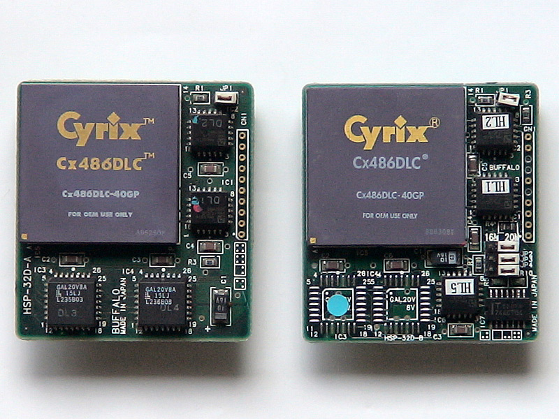 HSP-32D![]() Cyrix Cx486DLCを使用したBUFFALO製のPC-9801RA/DA用アクセラレータです。 Cyrix Cx486DLC-40GPを本体クロックの2倍で動作させます。 同じBUFFALO製の倍速アクセラレータであるHDL-20Wに比べ、基板が小型化されており、ZIFソケットのレバーと干渉することなく、直接CPUソケットに取り付け可能です。 当方が現物を入手した範囲では、実装部品等が異なるHSP-32D-AとHSP-32D-Bの2種類存在します。