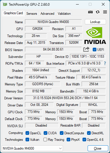 QUADRO P4000![]() PASCAL世代でお世話になったGEFORCE GTX 1070 KATANAと並べてみたくなり、2025年2月にHARD OFFにて、中古品を23000円で入手しました。