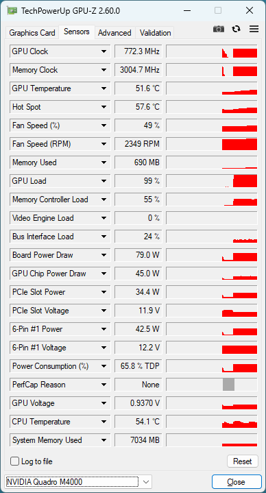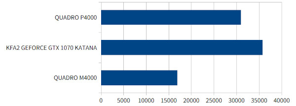 RYZEN 9 7950X3Dと組み合わせた場合、WILD LIFEがQUADRO M4000では16877だったものが、QUADRO P4000では、30991であり、世代の違いを感じさせられます。 一方、GEFORCE GTX 1070 KATANAの35741に対しては、クロックや演算ユニットの差なりに、性能が抑えられています。 。