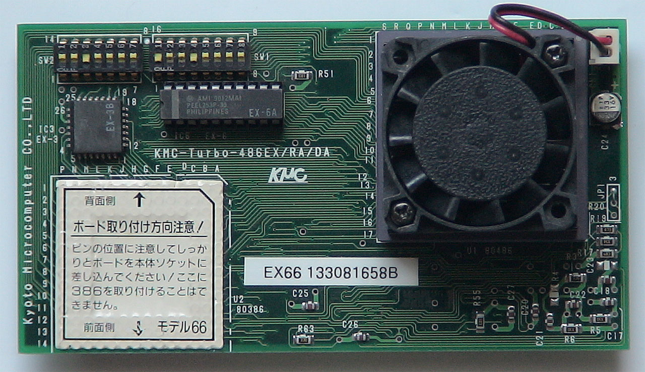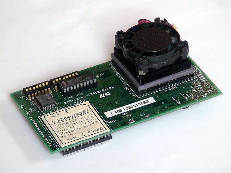 Turbo-486EX model66![]() i486DX2 66MHzを使用した京都マイクロコンピュータ製のPC-9801RA/DA用アクセラレータです。 「あなたの80386マシンを最新32ビット80486マシンにグレードアップ!」というキャッチフレーズで、一世を風靡しました。 [1台目(PC-9801DAにて使用)] [2台目(PC-9801RAにて使用)] 1台目![]() 当時メインマシンであったPC-9801DAで重くなりつつあった数々のフライトシムを軽快にしたいと思っていたのですが、ちょうどそのころ定価258000円のところメーカ直販半額セールになっていたので、血迷って1993年6月に142945円で購入しました。 概要アクセラレータは386用のソケットに装着するドータボードであり、PC-9801DAの場合には本来の386DXと差し替えて使用することになります。ボード上にはクロックジェネレータがあり、そこで、PC-9801DA本体のクロック 20MHzを1.5あるいは2.0倍しボード上のCPUに供給する仕組みになっています。倍率やその他割り込み許可の設定はボード上のディップスイッチで設定可能です。パッケージにはi486のL1キャッシュを有効にするためのデバイスドライバ等が同梱されています。また、付属のディスクを使用して起動するとIPLにてキャッシュをonにすることができ、その状態で別のディスクやHDDからOS等を起動できます。 アクセラレータ自身は結構大型でPC-9801DAのCPUソケットに一旦132ピンのアダプタソケットを装着し、それにアクセラレータ本体を装着します。
